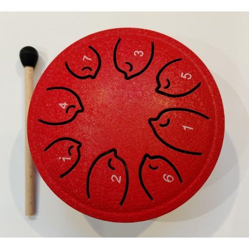 8 toņu metāla bungas/ zvongo/ zvangas sarkanā krāsā. Komplektā 2 vālītes un auduma maisiņš pārnēsāšanai., diametrs 11 cm/ augstums 6 cm. Var spēlēt gan turot plaukstā, gan liekot uz kādas virsmas. Piemērots ne tikai muzikālajām meditāciju nodarbībām, bet arī skaņu terapijai.