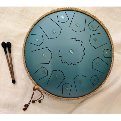 15 toņu metāla bungas/ zvanga 32.5 cm diametrā. Komplektā 2 sitamās vālītes un soma pārvadāšanai.